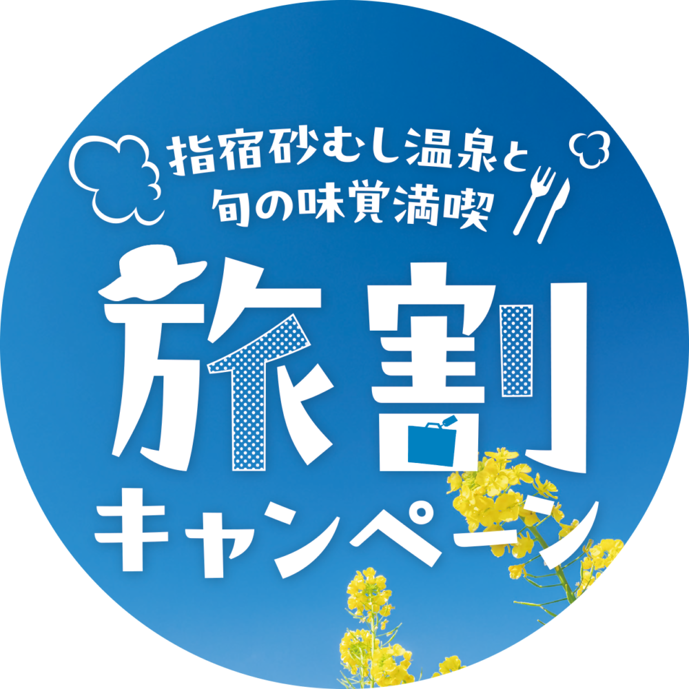 指宿市では、宿泊費の割引と市内での食事や買い物に使える最大3,000円分のデジタルクーポンを、令和8年2月限定で発行します。このキャンペーンの宿泊予約は、指宿の各宿泊施設に直接の電話予約やホームページからの予約のみ対象となっております。期間中は、砂むし会館「砂楽」において、2月限定で砂浜から立ち昇る湯けむりのライトアップや、市の花である菜の花が施設を彩ります。また、期間中は旬の味覚が味わえる「いぶすき春のグルメ祭」も開催予定です。ぜひこの機会に、指宿温泉名物「砂むし温泉」と指宿ならではの「旬の味覚」を満喫し、指宿でしか味わえない贅沢なお時間をお過ごしください。